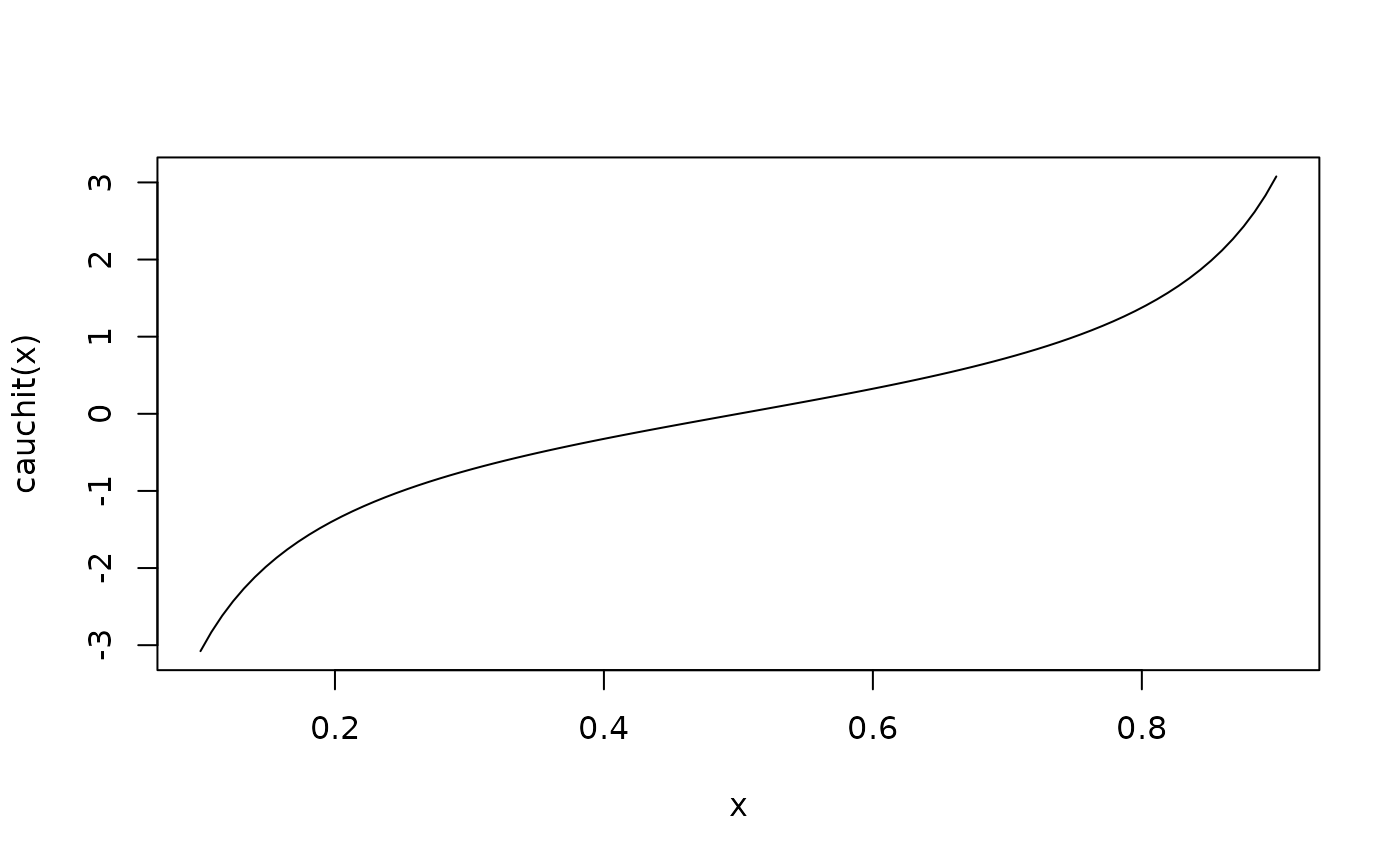 x <- seq(from = 0.1, to = 0.9, length.out = 100) plot(x, cauchit(x), type = "l")