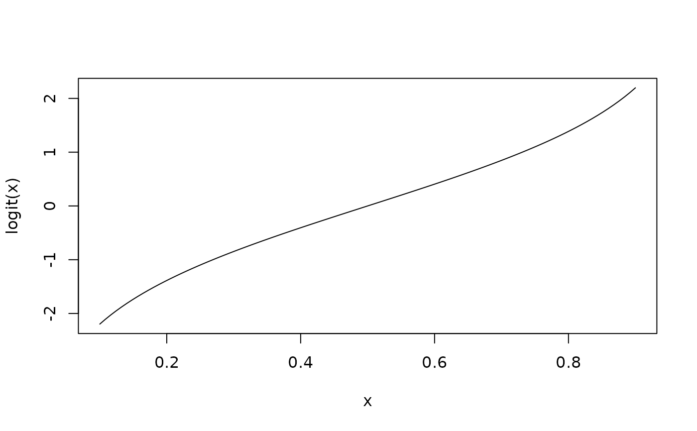 x <- seq(from = 0.1, to = 0.9, length.out = 100) plot(x, logit(x), type = "l")