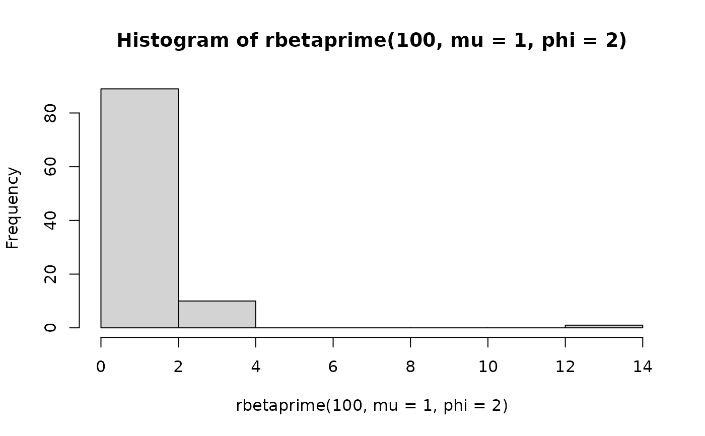 rbetaprime(n, mu = 1, phi = 1)