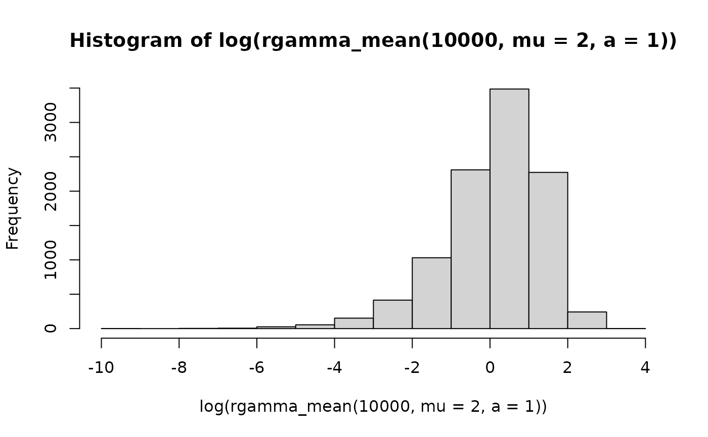 hist(log(rgamma_mean(10000, mu = 2, a = 1)))
