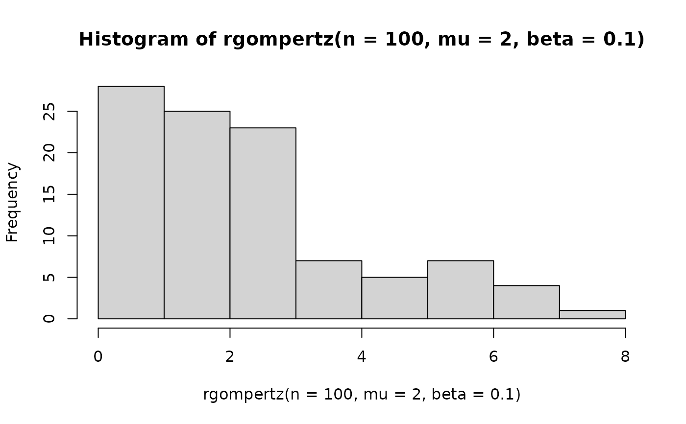 hist(rgompertz(n = 100, mu = 2, beta = 0.1))