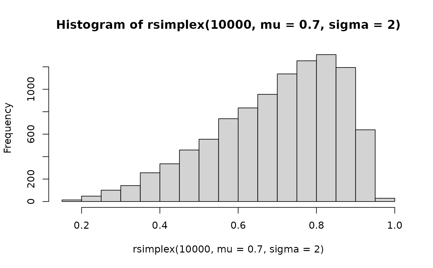 hist(rsimplex(10000, mu = 0.7, sigma = 2))