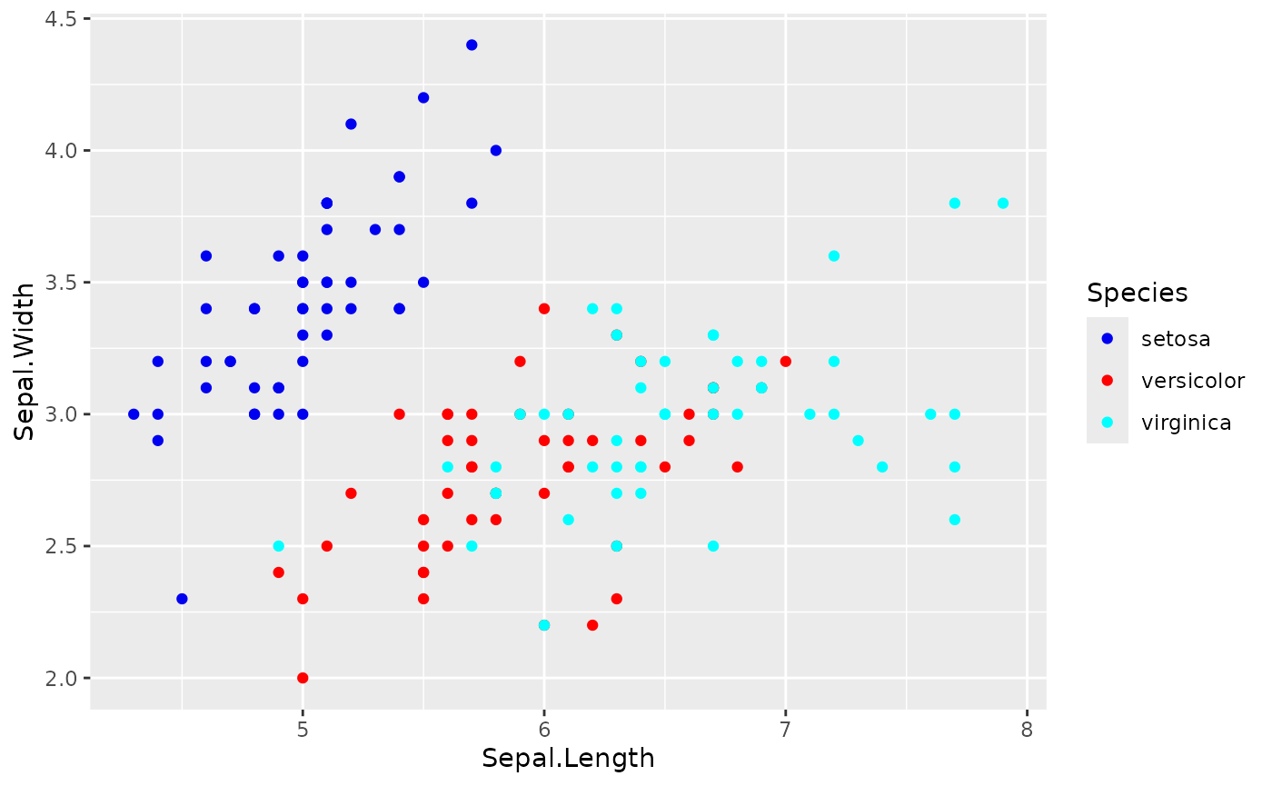 ggplot(iris, aes(Sepal.Length, Sepal.Width, color = Species)) +