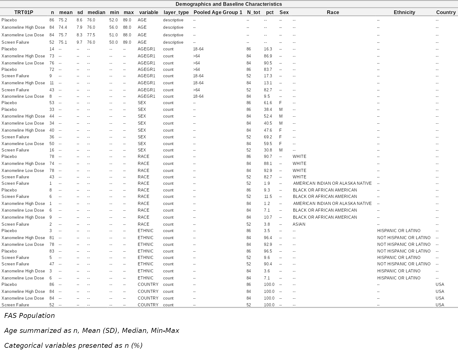 create_demographics_table(adsl) # Uses ARM instead of TRT01PValidation